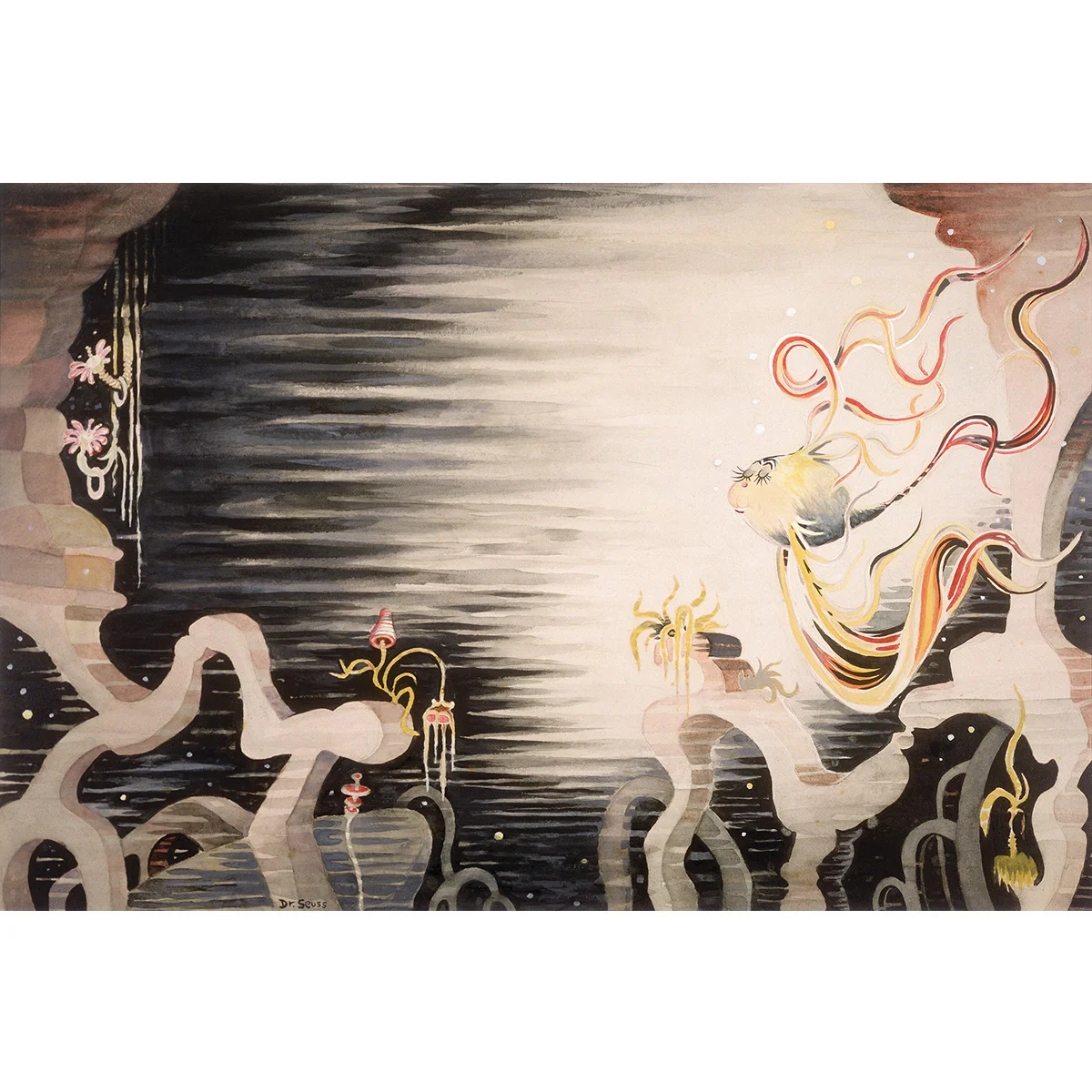 The majority of Dr. Seuss’s children’s books, from 1948 to 1990, were written and illustrated in his hilltop sanctuary, constantly in sight of this dazzling spectacle of nature. Many of Ted’s Secret Art paintings were also created looking out at this oceanic spectacle, including two major seaside paintings that directly reflect his wide range of artistic moods.